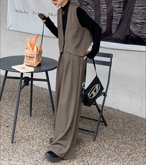 ノーブランドトレンドのジレ(ベスト)と、美しい落ち感のワイドパンツを組み合わせた、感度の高いセットアップアイテム。 セットでの着用はもちろん、それぞれ単品でも着回し力抜群の、ワードローブに欠かせない一着です。 洗練されたシルエット: コンパクトな丈感のベストが重心を上げ、ワイドパンツの脚長効果を最大限...