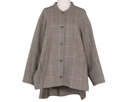 LILASIC・バックヘムをラウンドさせAラインに仕立てたブルゾンです。ヒップが隠れる着丈で、脇にベンツスリットを入れたデザインです。ノーカラー風ですが、バックネックがスタンドカラーの立体的な仕立てです。両脇ポケットあり。・ツイードのチェック柄素材です。表に自然な起毛感がある、ウール混紡素材です。 ...